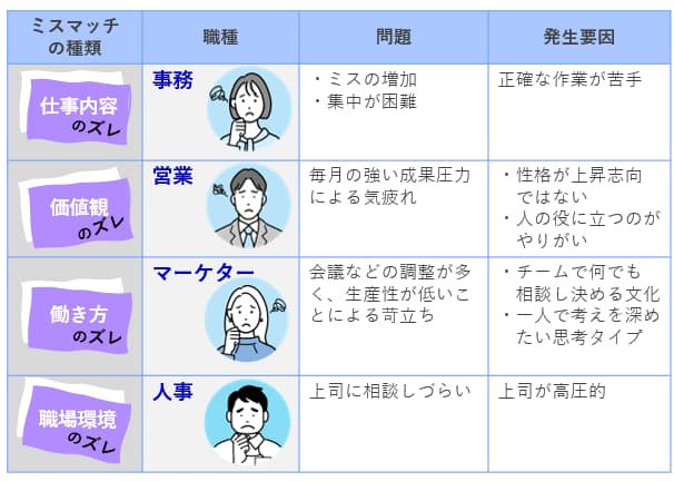 仕事が向いてないと感じる背景には、主に次のようなミスマッチがあります。