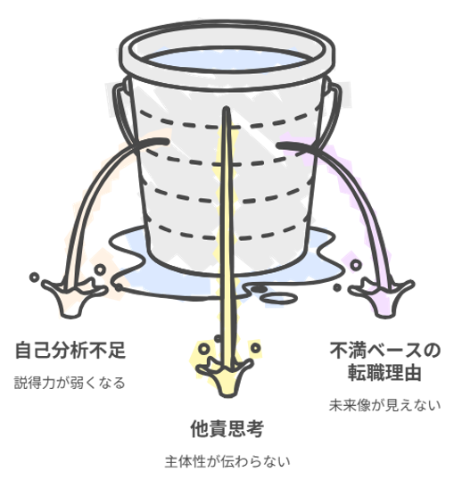 自己分析が不足すると面接で話す内容が表面的になり、「前職が悪い」という説明はネガティブに受け取られると同時に、企業から求職者の未来像が見えにくくなってしまいます。