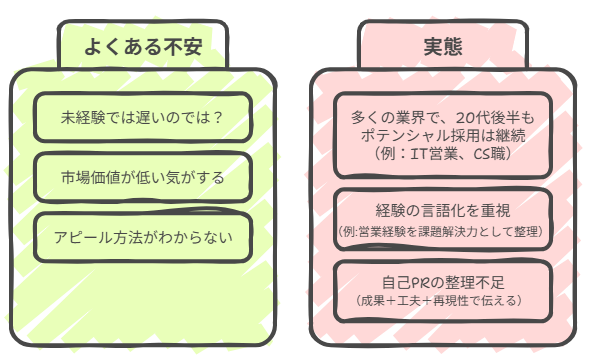 実態は多くの業界で20代後半もポテンシャル採用を継続しており、キャリアチェンジが可能です。また、これまでの経験を棚卸しし、「成果+工夫+再現性」で伝えることで、強みとして言語化することができます。このように正しい整理を行えば、これらの不安は解消できます。