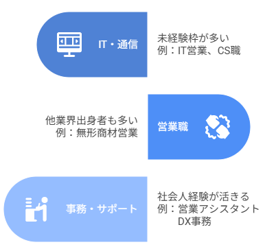 以下の業界や職種は、未経験歓迎の求人も多く、またこれまでの社会人経験で培ったスキルが活用できるため、キャリアチェンジにおすすめです。