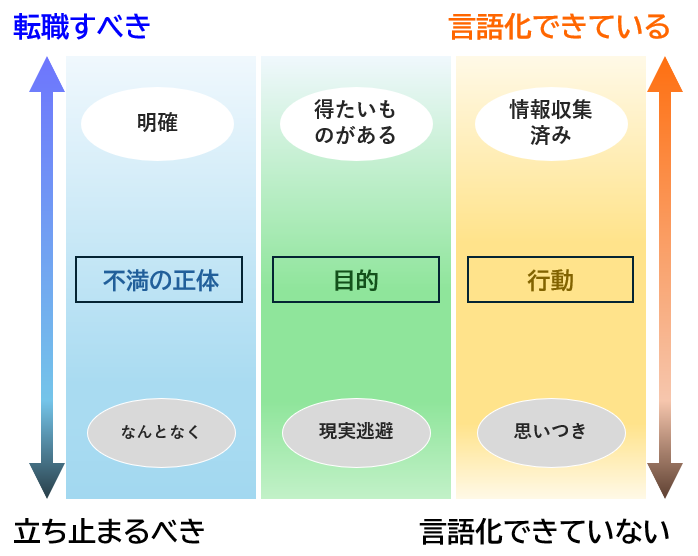 27歳からの転職は「目的」ではありません。自分の理想とするキャリアや人生を築くための「手段」であることを認識し、転職すべきか/立ち止まるべきか整理する必要があります。