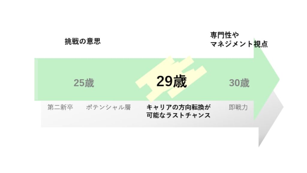 未経験転職が29歳で分岐点と言われるのは、企業が学習スピードや吸収力を評価しやすい年齢だからです。20代後半まではポテンシャル採用が成立しやすい一方、30代以降は即戦力前提の求人が増える傾向にあるのもそのためです。