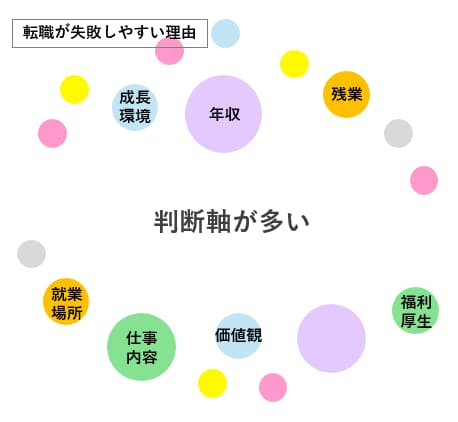 転職の失敗は「判断軸のズレ」から起こりやすいと言われます。判断軸が多くあると様々な観点で物事を考えるため、考えがぶれてしまい転職を失敗する要因にもなります。