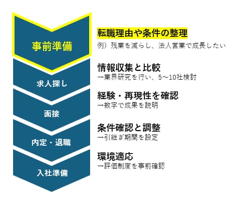 特に重要なのが最初の事前準備で、ここが曖昧なままだと、求人選びや面接で判断軸がぶれやすくなります。企業側も一貫性を重視するため、転職理由・希望条件・キャリアの方向性が整理されていないと評価が下がる可能性があります。