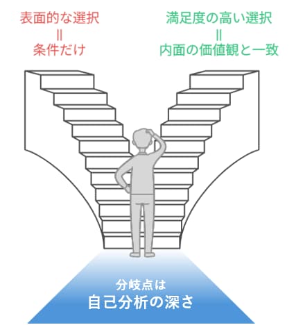 年収や休日といった条件は重要ですが、それだけで判断すると仕事内容や社風とのズレが生じやすくなります。条件は「結果」であり、「どんな環境で力を発揮できるか」という視点が欠けると、満足度が下がる可能性があります。