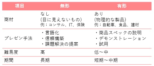 商材が目に見えない・触れないような「無形商材」か、製品として物理的に存在する「有形商材」なのかによっても、営業の仕方は大きく異なります。