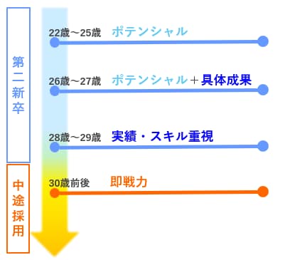 ポテンシャル採用の観点から、25歳前後が一つの目安とされることがあります。ただしこれは絶対基準ではありません。業界・企業規模・職種によって異なります。