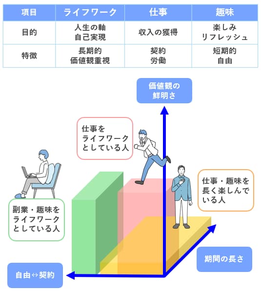 副業は「収入を得るための活動」であることが多いのに対し、ライフワークは「人生の軸となるテーマ」です。ただし、副業として始めた活動がライフワークに発展するケースもあります。
