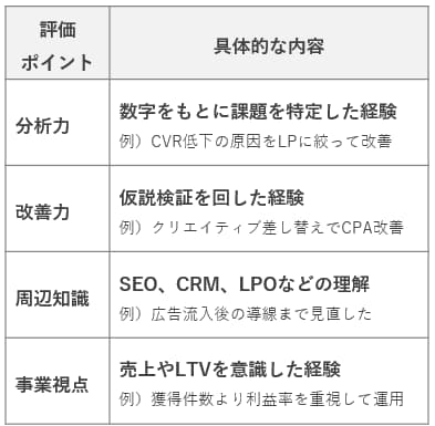 評価されるのは、媒体知識そのものより、 どのように分析し、仮説を立て、改善を回したかです。
