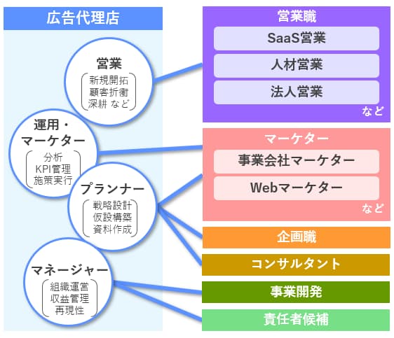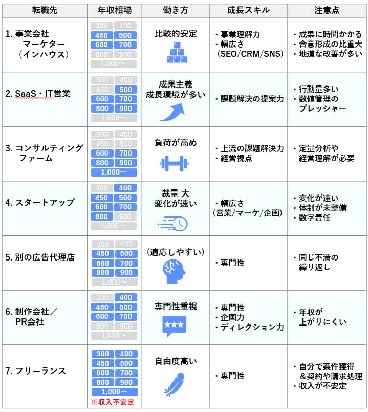 実際、広告代理店で培いやすい提案力、調整力、数値改善力、顧客理解は、事業会社、SaaS、コンサル、スタートアップなど幅広い転職先で活かせます。
