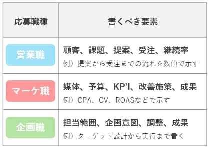最も重要なのは自身の経験・成果・その理由を言語化できることですが、その内容が応募先の仕事と親和性が高ければ、さらに評価してもらいやすくなります。