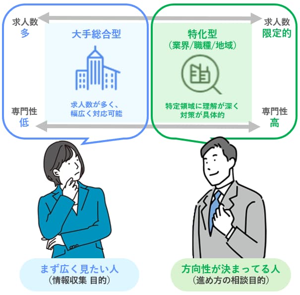 一方で特化型は、特定の領域に理解が深いため、選考対策などが具体的で、一歩踏み込んだ転職活動ができます。既にある程度キャリアの方向性を定めていて、業界・職種・地域などで目指すものがある方には向いていますが、どんなキャリアを築きたいか曖昧な方の場合は、選択肢を狭めることになります。