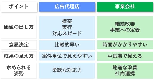 広告代理店ではスピード感が重視されやすい一方、事業会社では社内合意形成に時間がかかることがあります。この違いを理解せずに転職すると、「思っていた仕事と違う」と感じやすくなります。