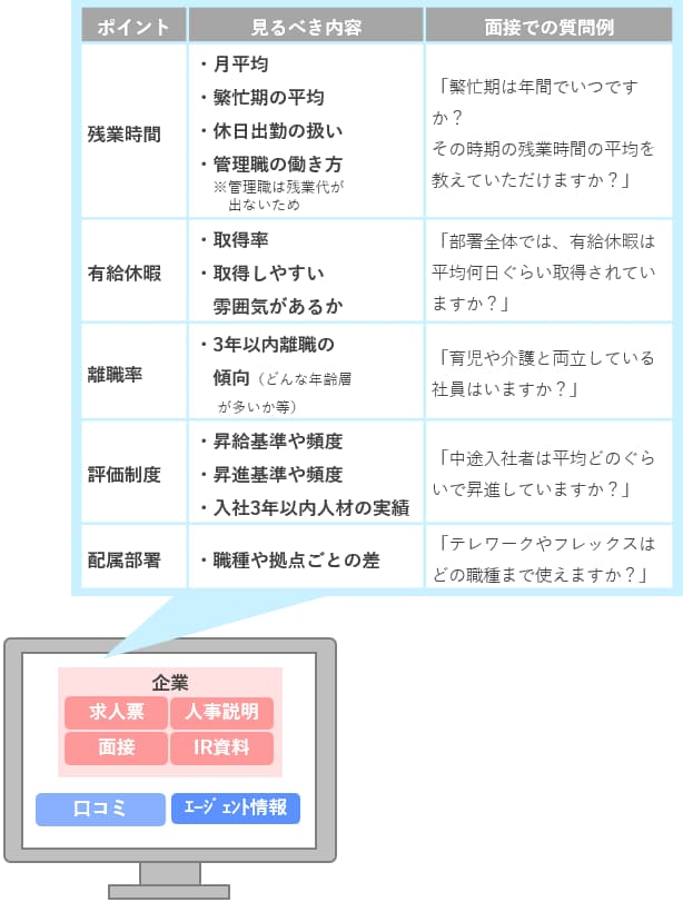 ワークライフバランスを重視するなら、業界比較の次は企業比較です。以下の表は、求人票や面接で確認したいポイントを整理したものです。